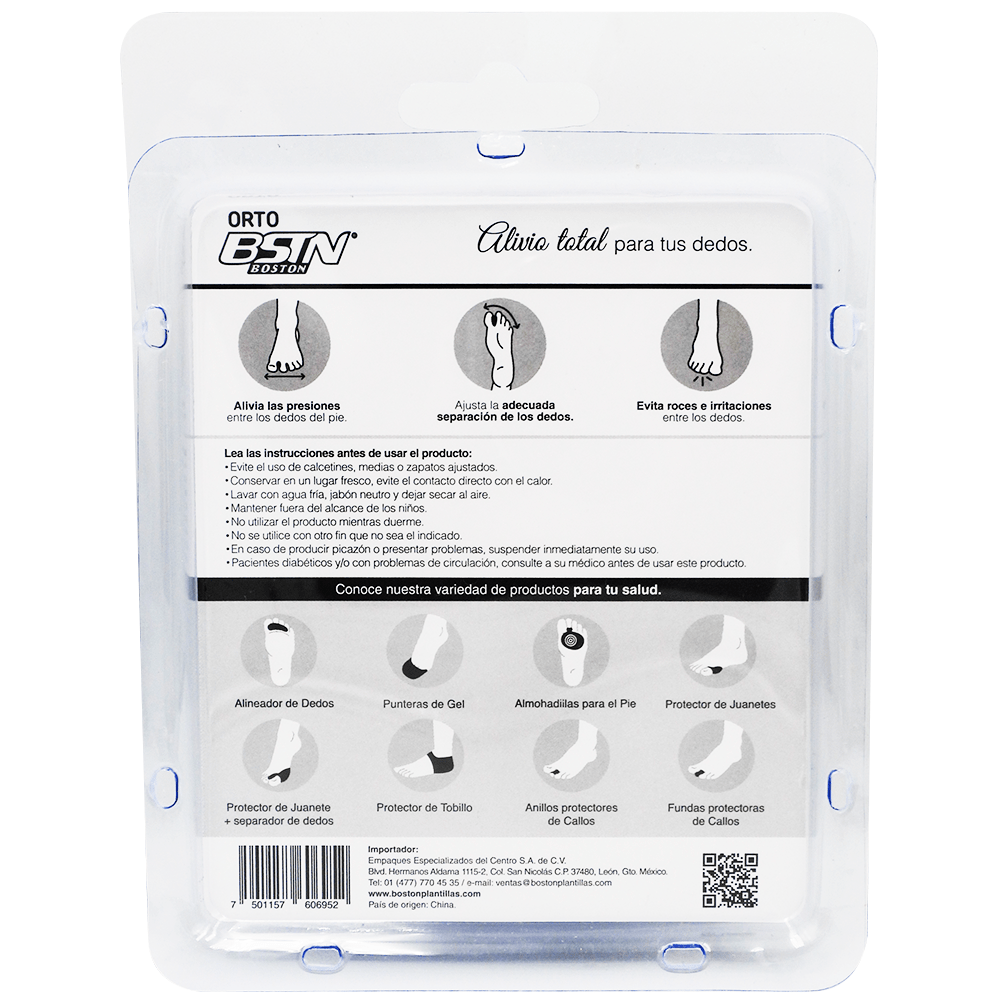 Este separador de dedos es ideal para cualquier persona que busque mejorar su salud podológica. Es especialmente recomendado para quienes pasan largas horas de pie, utilizan calzado apretado o practican deportes que exigen un uso intensivo de los pies. Con el Separador De Dedos Talla Única 1 Par Boston, podrás disfrutar de una alineación natural de los dedos, lo que no solo mejora la comodidad, sino que también previene futuras complicaciones en tus pies.
